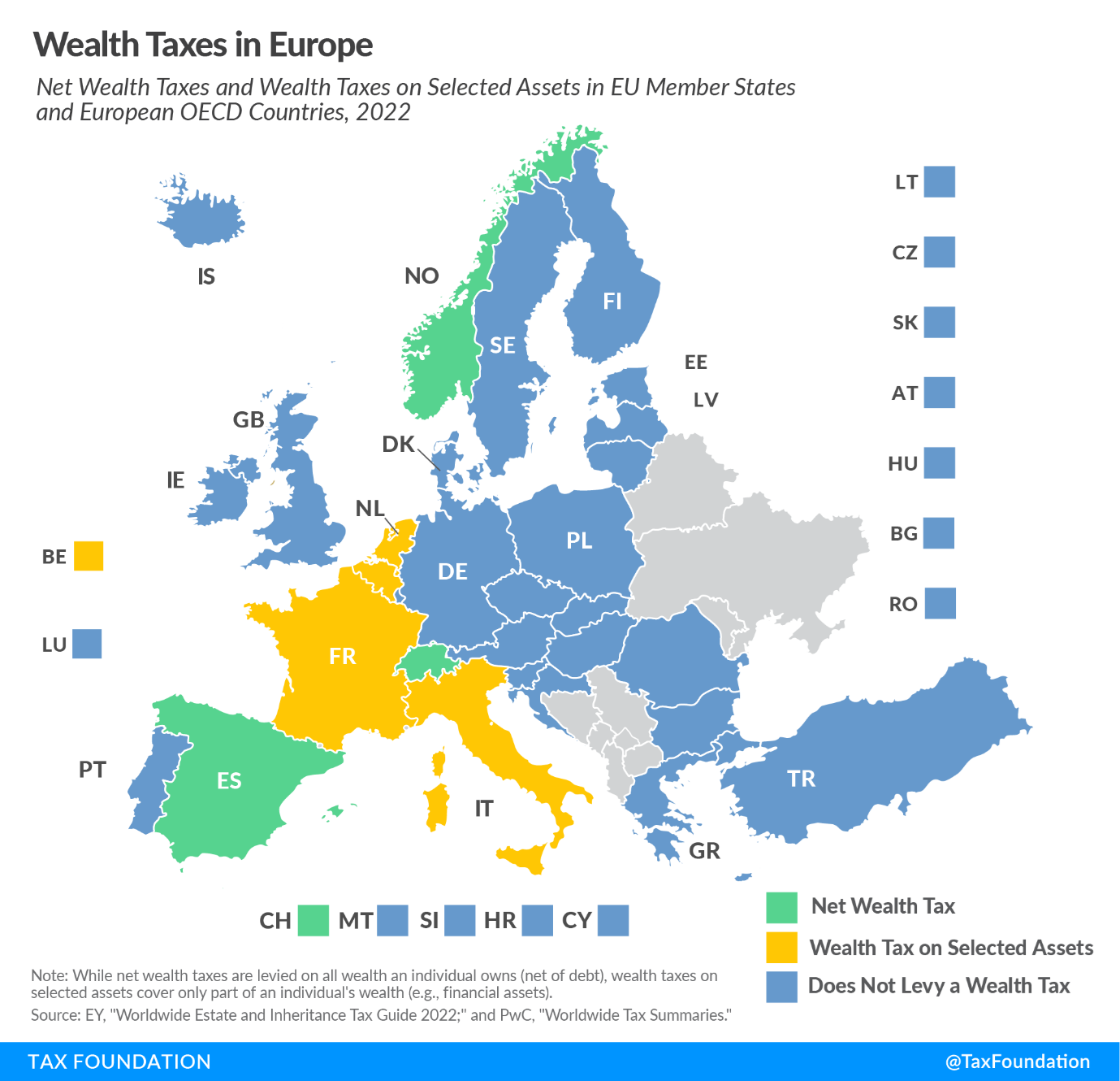 Wealth taxes are recurrent taxes on an individual’s wealth, usually they are net wealth taxes, net of debt. A net wealth tax is similar to a real property tax, but it covers all wealth an individual owns. Only three European countries levy a net wealth tax—Norway, Spain, and Switzerland. France and Italy levy wealth taxes on selected assets by the taxpayer, and so do Belgium and the Netherlands.